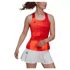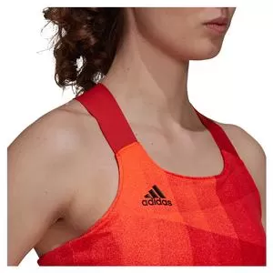 Summons the Summer Sports in this adidas Women’s Primeblue Heat.Rdy Tokyo Y-Back Tennis Tank Top in App Solar Red and Black. Made from Primeblue material that is 100% recycled polyester, this tennis tank will keep you in the game from the first point to a nail-biting finish. With HEAT.RDY technology, your sure to stay cooler during the hot summer months since this tank has targeted key ventilation zones. It also features FreeLift construction which enhances your range of motion, allowing you to get to your next shot, and even hit a winner! With a vibrant zig-zag pattern, low rounded neck and Y-Back design, this tank is sure to keep your opponent guessing about your next shot, but not your sense of fashion! Be sure to pair this tank with other quality apparel by adidas for a truly winning ensemble.