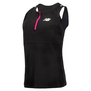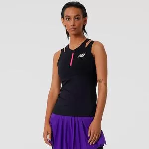 Get into the game with our New Balance Women`s Tournament Keyhole Tennis Tank Black. This tennis tank has a built-in shelf bra to provide added support. It also has a center front zipper that brings a pop of bright pink color. Plus it has a two-in-one racerback with shoulder slits that allows you full mobility and keyhole cutouts provide increase breathability while you play. It is also equipped with NB DRY that offers fast drying technology and moisture-wicking fabric to keep you cool and comfortable during any match. Pair with your favorite bottoms for a killer combo.
