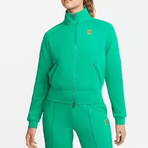 Warm up in style in the Nike Women’s Court Full Zip Tennis Jacket. The slightly cropped length and streamlined silhouette lend this jacket a chic, modern touch. The raglan sleeves offer a free range of motion so you can practice your swing, and the zippered pockets allow for convenient storage. Nike’s sweat-wicking Dri-FIT technology works hard to keep you dry and cool. With a 2-way zipper, you can wear this cool-weather essential however you like!