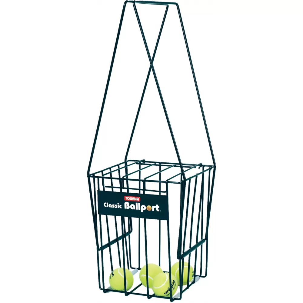 The Tourna Ballport Classic 70-Ball Tennis Ball Hopper securely holds and picks up 70 standard tennis balls